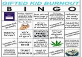 Gifted kid behavior is absolutely real. Recently, a bingo chart was going around the internet with a list of items that indicate you might be a gifted burnout. Gifted kid burnout bingo posted by skip1005 at 12:18 pm. I get the feeling—falling behind and watching everyone catch up. Recovering gifted kid burnout bingo (i.imgur.com).